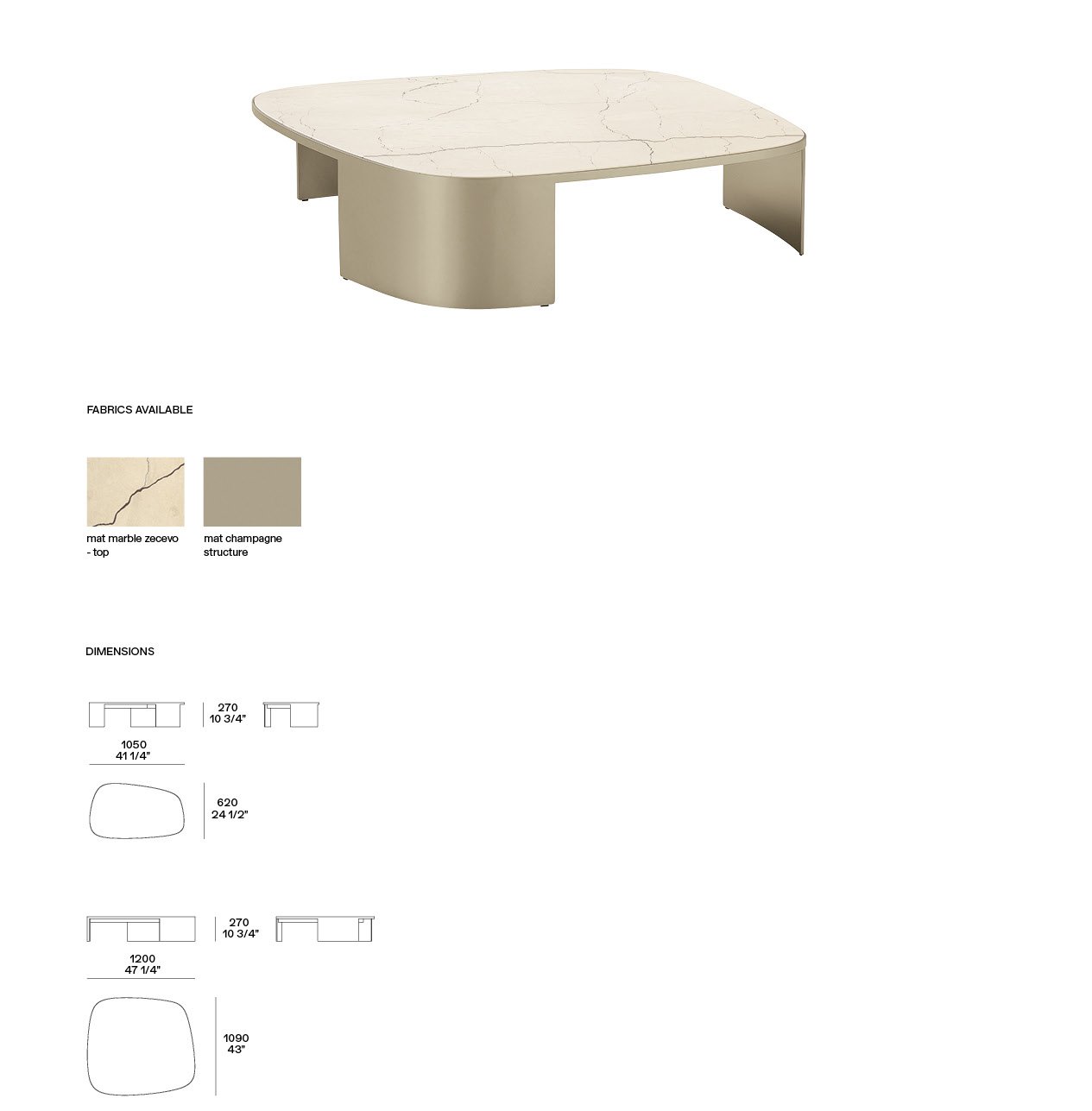 Coffee table available in two dimensions. Structure in metal painted mat champagne and top in mat marble zecevo.