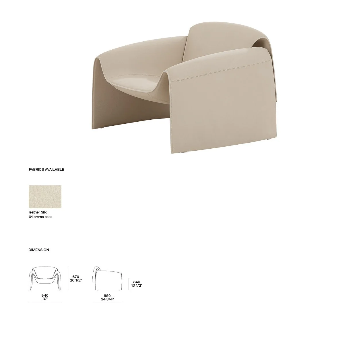 Armchair with non-removable cover in leather Silk 01 crema. Floor support with chutes in transparent plastic material.